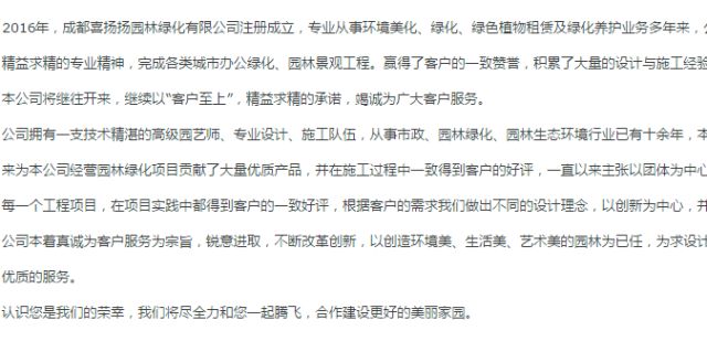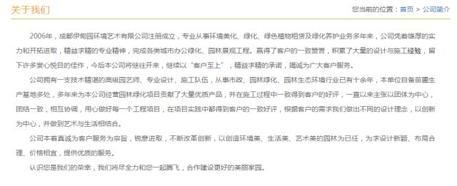 成都伊甸园环境艺术有限公司注册成立于2006年,距今已经有12个年头,专业从事环境美化、绿化、绿色植物租赁及绿化养护等业务,经过多年来的打拼,才立足于行业,拥有了良好的口碑。这是伊甸园在公司网站www.cdedy.com公司简介里写的: