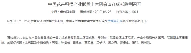 伊甸园的大家长周君先生在2017年6月10日参加了中国花卉租摆联盟主席团会议,会议地点在伊甸园基地总部,期间来自全国各地的产业小组成员和联盟主席团成员之间进行了深入交流,会议达成一致,对产业联盟章程进行了修订,对行业发展起到了积极作用。